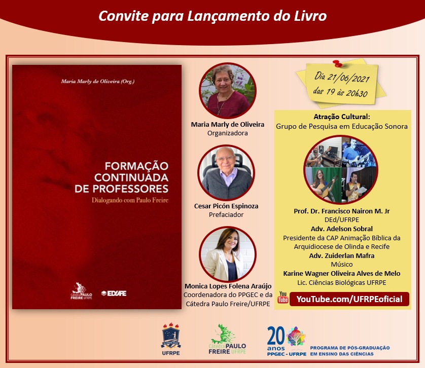 A Cátedra Paulo Freire e o Programa de Pós-Graduação em Ensino das Ciências – PPGEC   da Universidade Federal Rural de Pernambuco – UFRPE, realizam, no próximo dia 21/06, às 19h,  a Solenidade de Lançamento do Livro “FORMAÇÃO CONTINUADA DE PROFESSORES: Dialogando com Paulo Freire”.
