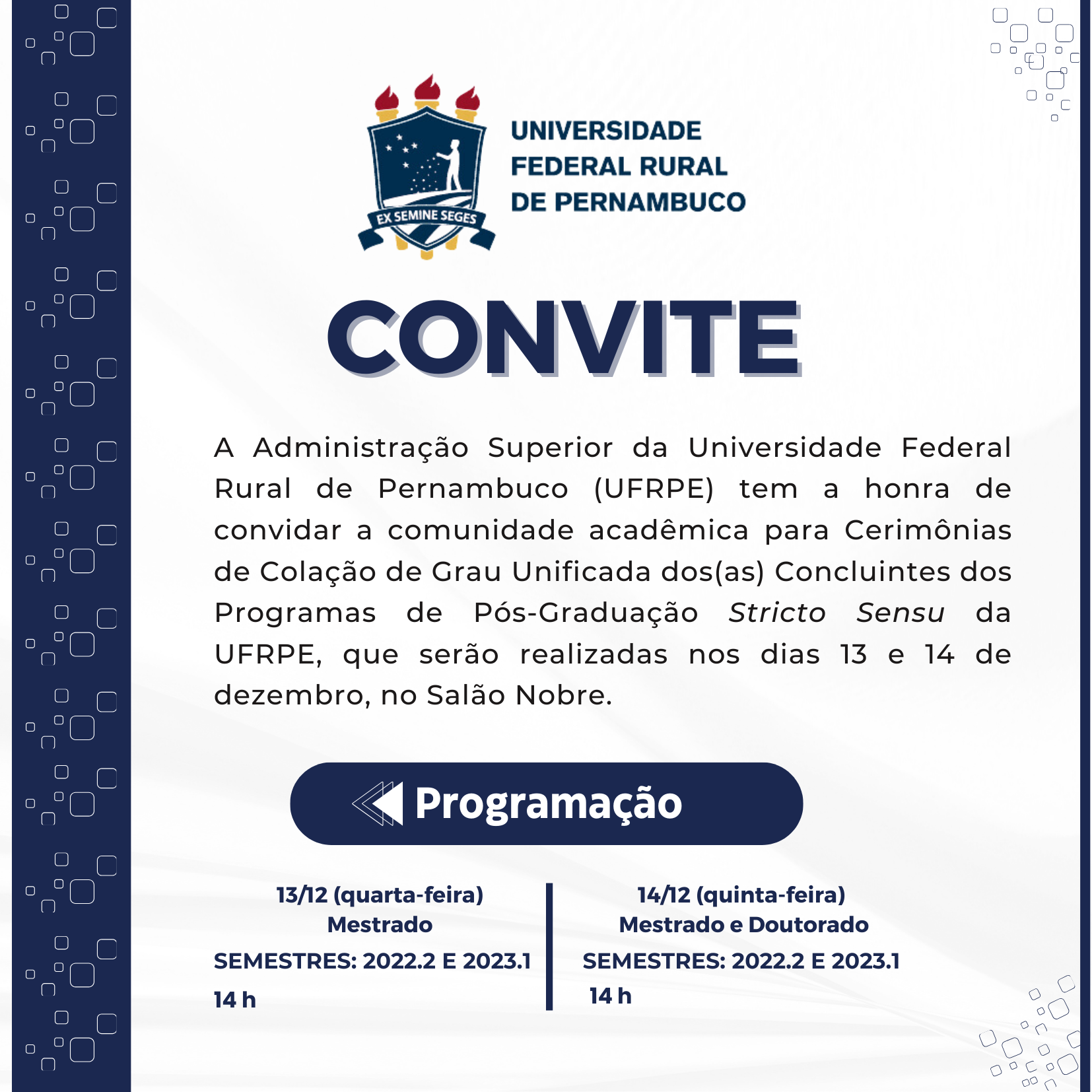 A Universidade Federal Rural de Pernambuco (UFRPE) celebra, nos dias 13 e 14 de dezembro de 2023, às 14h, no Salão Nobre, em Dois Irmãos, a Colação de Grau dos(as) concluintes dos Programas de Pós-Graduação (Mestrados e Doutorados), referentes aos semestres 2022.2 e 2023.1.