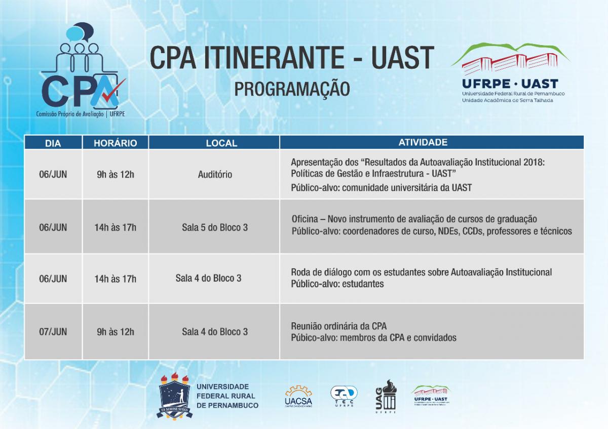 A Comissão Própria de Avaliação (CPA) realizará, nos dias 6 e 7 de junho, na Unidade Acadêmica de Serra Talhada (UAST/UFRPE), a segunda edição do “CPA Itinerante”. Trata-se de uma ação que visa fortalecer o papel da autoavaliação institucional no planejamento das Unidades Acadêmicas, tendo em vista as suas especificidades locais.