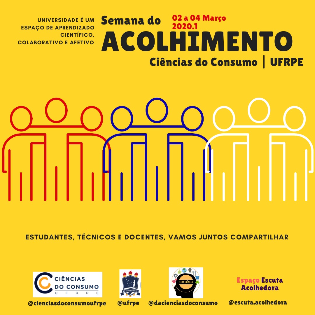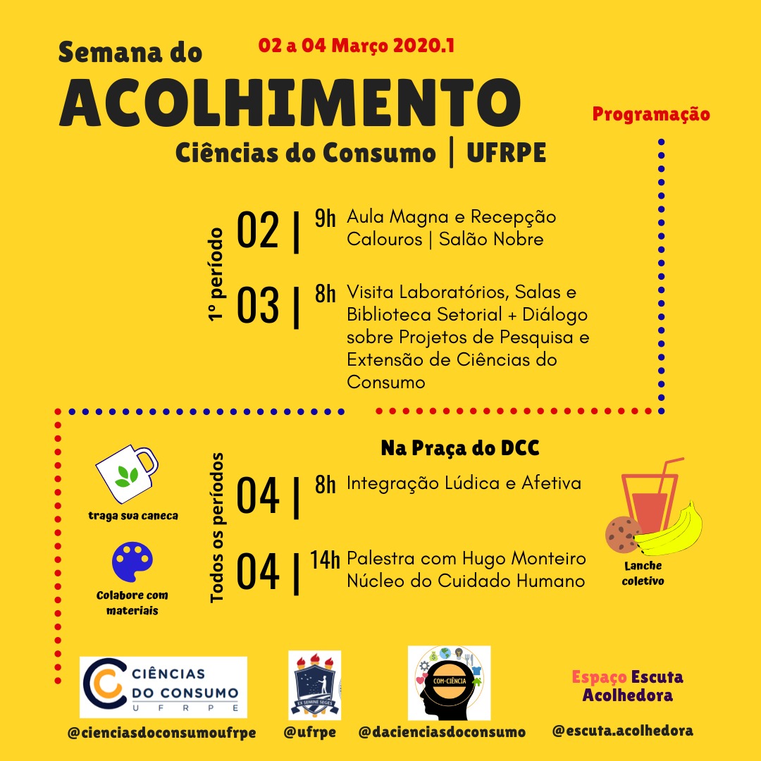Para iniciar o semestre acadêmico de 2020.1 a Coordenação de Ciências do Consumo, DA de Ciências do Consumo Gestão COM-Ciência e a iniciativa Espaço Escuta Acolhedora estão promovendo a Semana do Acolhimento junto ao corpo discente e docente do curso.