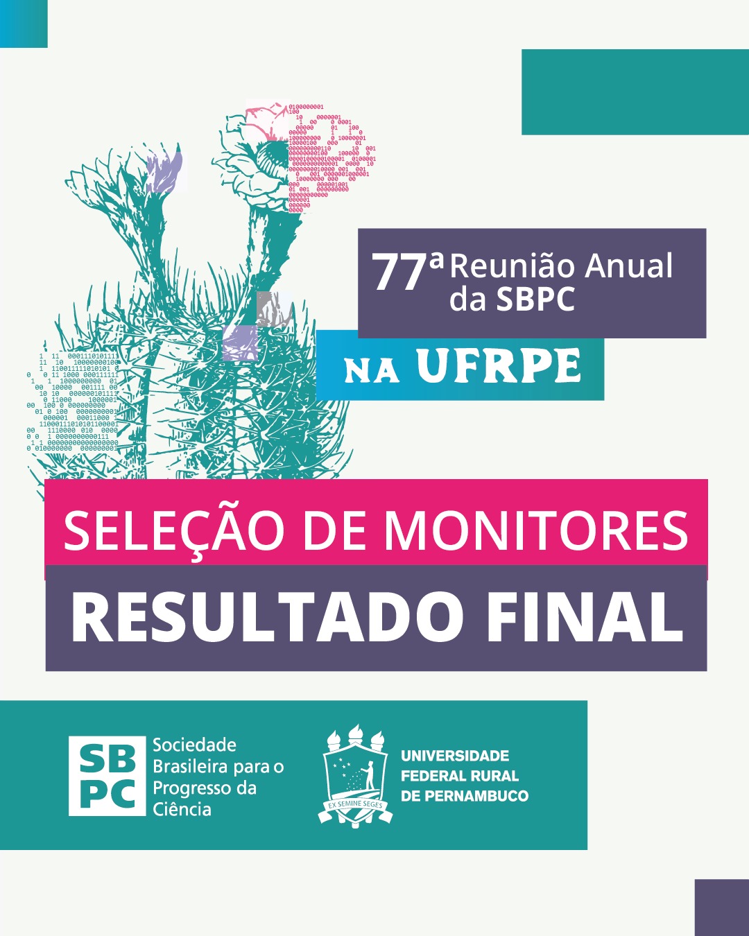 A Organização da 77ª Reunião Anual da Sociedade Brasileira para o Progresso da Ciência (SBPC) divulgou o resultado final da seleção de monitores para a SBPC, que acontece na UFRPE de 13/07 a 19/07. Ao todo, 1600 pessoas se candidataram para a monitoria da 77ªRA da SBPC.