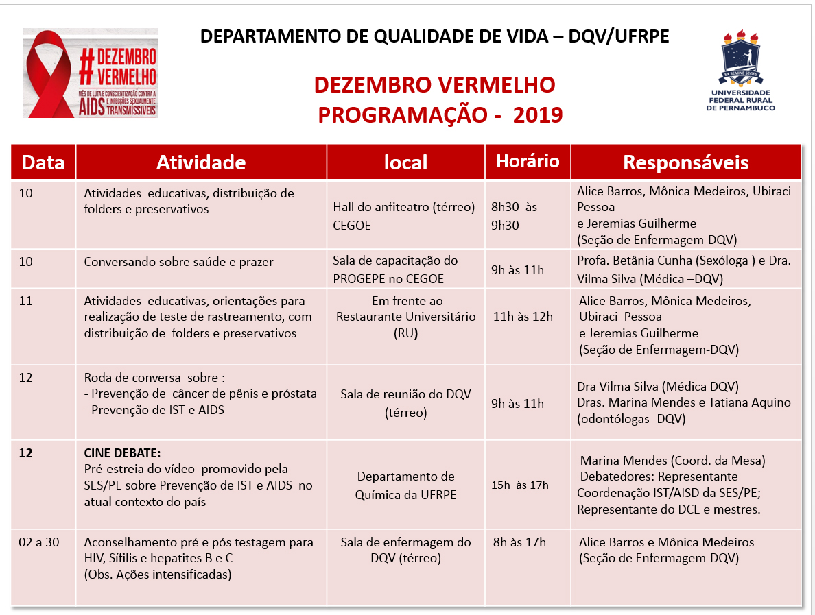 O Departamento de Qualidade de Vida (DQV) da UFRPE, em parceria interinstitucional com a Secretaria Estadual de Saúde de Pernambuco (SES/PE), realizam a campanha Dezembro Vermelho. A agenda de atividades e orientações ocorrem durante todo o mês e contará com rodas de diálogo, palestras e cine debates sobre a prevenção e tratamento da AIDS e infecções sexualmente transmissíveis.