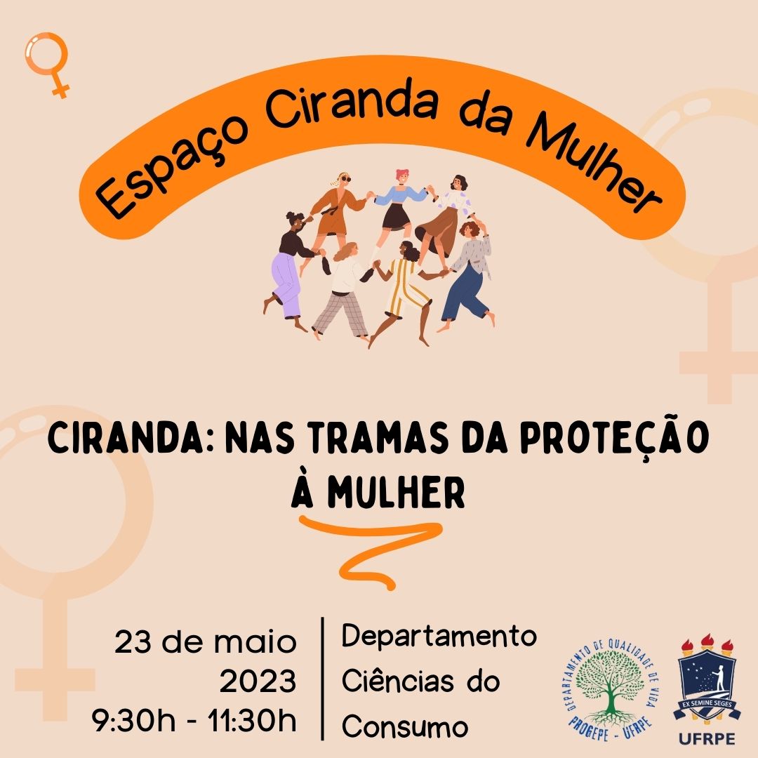 A palestra sob o tema " Nas tramas da proteção à mulher" será realizada no dia 23/05/23 (terça-feira) às 9:30h, no DCC e tem como público-alvo as mulheres trabalhadoras da firma prestadora de serviços da UFRPE.
