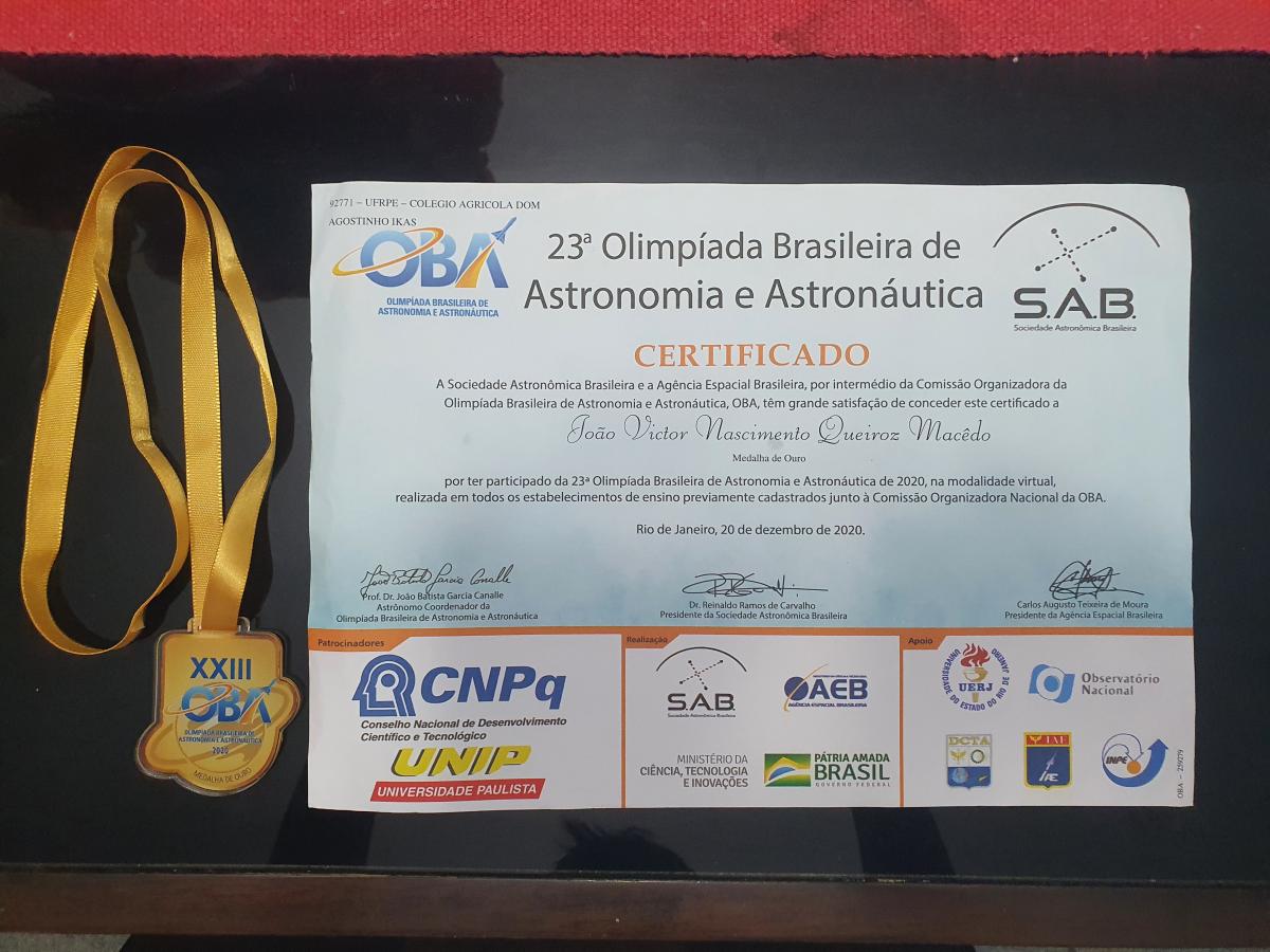 O aluno João Victor Nascimento Queiroz Macêdo, do 3º ano do Colégio Agrícola Dom Agostinho Ikas da UFRPE (CODAI/UFRPE), foi o único participante do CODAI na 23ª Olimpíada Brasileira de Astronomia e Astronáutica (OBA). João Victor participou do nível 4 e atingiu a nota de 9,75 na prova, em uma escala de 0 a 10. Com este resultado, conquistou uma medalha de ouro que foi entregue ao estudante no final de abril deste ano. O incentivo para participar partiu do professor Mercel Santos.