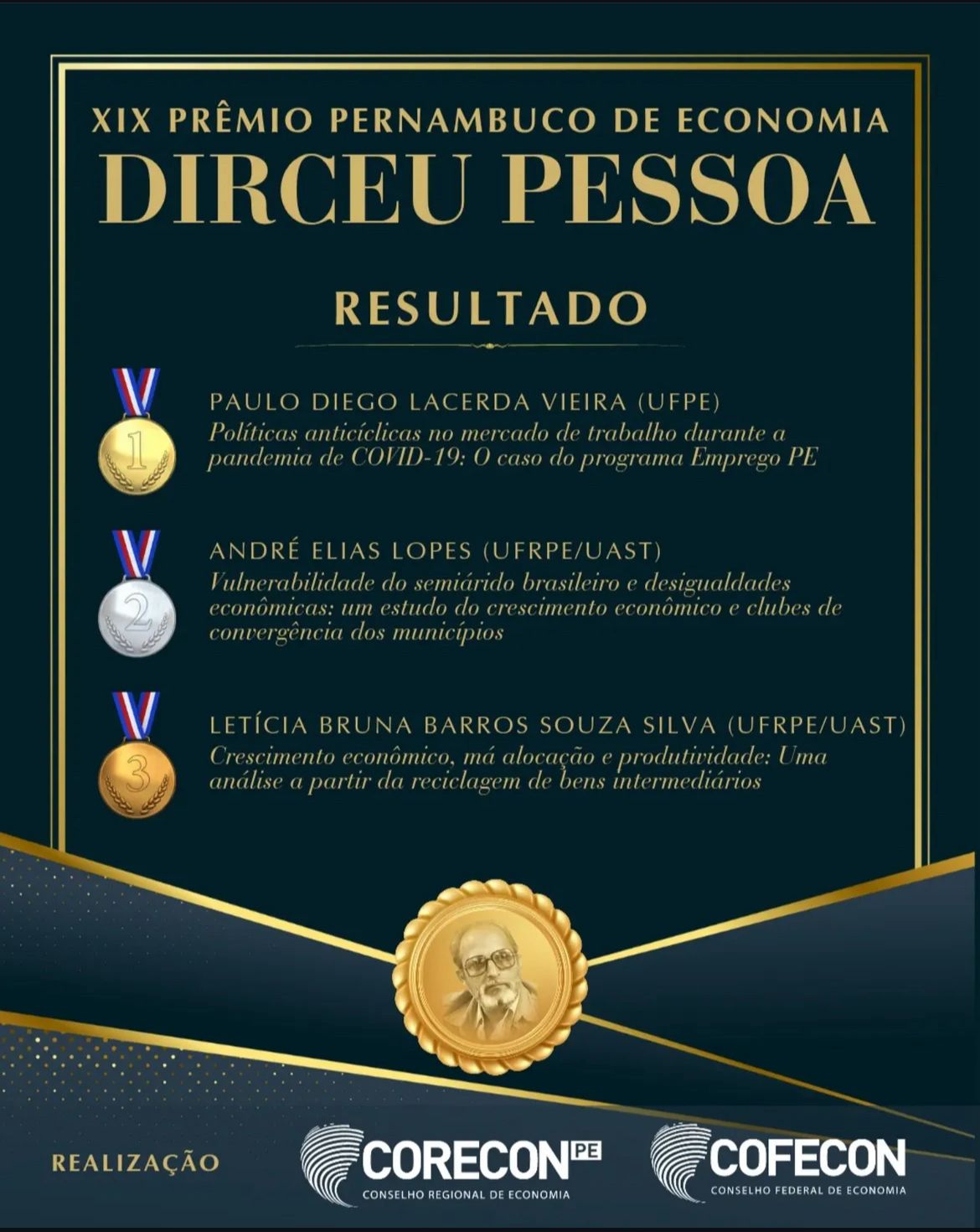 A equipe do Bacharelado em Ciências Econômicas da Unidade Acadêmica de Serra Talhada (UAST/UFRPE) celebra mais uma conquista no Prêmio Dirceu Pessoa, maior premiação de monografias em Economia de Pernambuco. Os estudantes André Elias Lopes e Letícia Bruna Barros Souza Silva, orientados pelo Prof. Dr. Sergiany da Silva Lima e prof. Dr. Kleyton José da Silva Pereira de Siqueira, do Núcleo de Economia Aplicada ao Semiárido (NEASA) alcançaram, respectivamente, o 2º e 3º lugares com seus trabalhos.