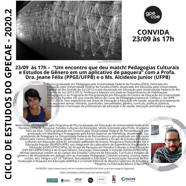 O próximo encontro acontecerá nesta quarta-feira, 23/09, das 17h às 19h via Canal do GPECAE no Youtube, com a presença da docente. Jeane Félix (PPGE/UFPB) e do Mestrando Alcidesio Júnior (PPGE/UFPB), discutindo o tema "Um encontro que deu match! Pedagogias Culturais e Estudos de Gênero em um aplicativo de paquera"
