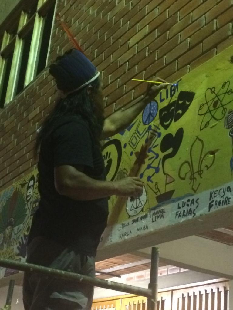 Nesse mesmo período, Jaider ofereceu uma oficina em que guiou a comunidade acadêmica e quem mais quisesse se aprochegar para pintar um mural no bloco 3. Fizemos rodas de conversa, trocamos vivências sobre a Amazônia e a Caatinga, aproximamos mundos a partir dos deslocamentos de aprendizagem propostos por Jaider. Em 2017, mais uma vez com incondicional apoio e generosidade de Jaider, reeditamos a exposição It Was Amazon durante os dias de exibição da I Mostra de Cinema Indígena da UAST-UFRPE.