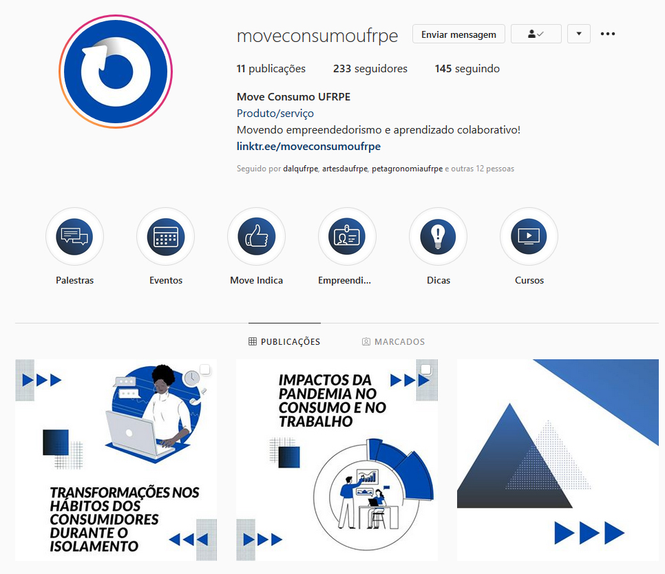 Assim, desenvolvendo um espaço de comunicação online e aberto para reunir, organizar, divulgar e formar negócios de estudantes da UFRPE e promover outras informações sobre consumo e temas de interesse em tempos de Covid-19. O Move Consumo é direcionado para não apenas atender os estudantes da UFRPE, mas também todos os interessados que queiram consumir dos empreendimentos ou aprender mais sobre consumo e empreendedorismo.