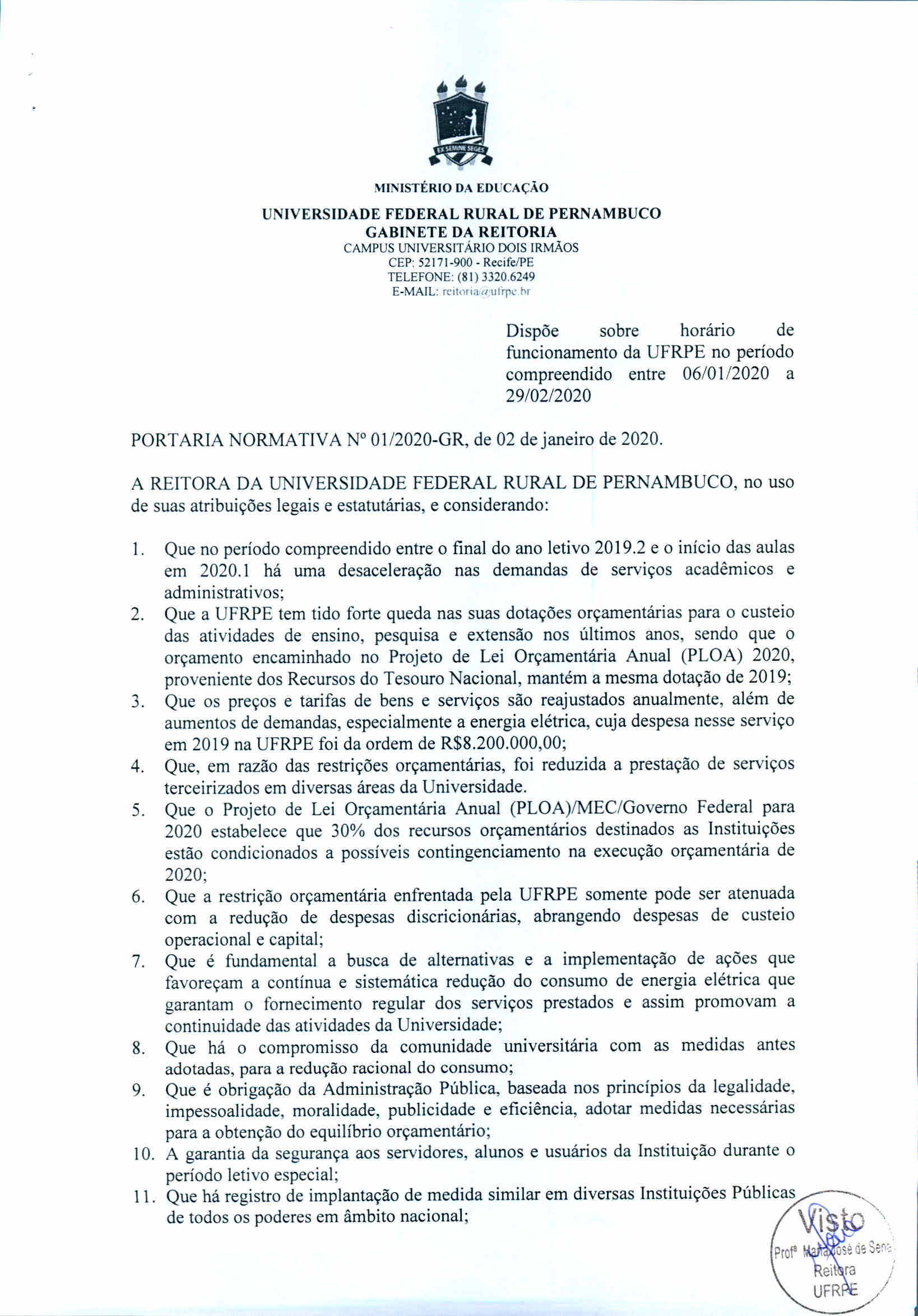 A Reitora da Universidade Federal Rural de Pernambuco no uso das suas atribuições estatutárias, considerando o disposto na Portaria 01/2020-GR NORMATIZA:
