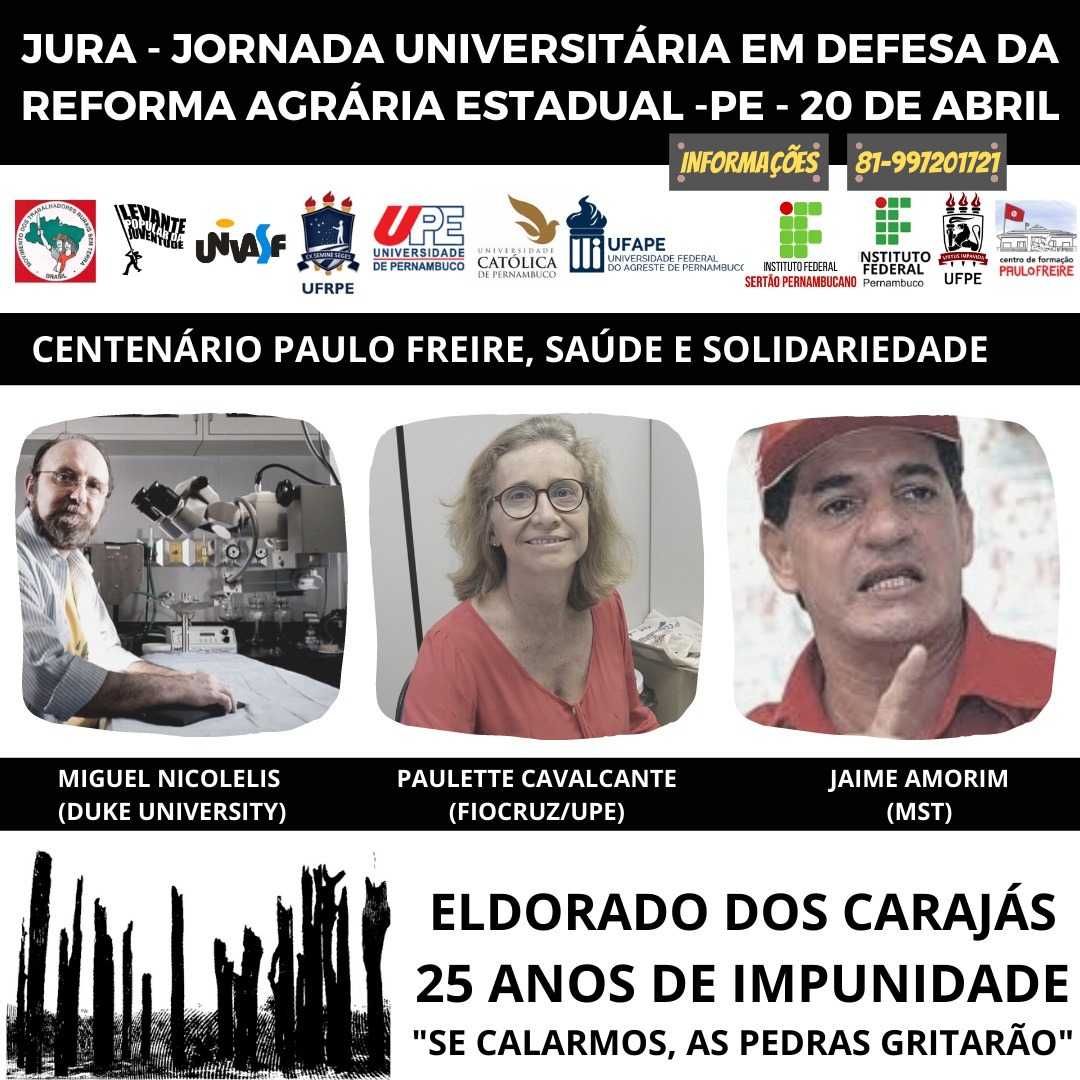 Nesta próxima terça feira, 20 de Abril, às 18 horas, iremos lançar a nossa JURA - Jornada Universitária em Defesa da Reforma Agrária Estadual -PE, no formato virtual, com o tema: Centenário Paulo Freire, Saúde e Solidariedade. Essa é uma parceria entre MST, Levante Popular da Juventude, UFRPE, UFPE, UPE, UNIVASF, UPE, UNICAP, IF-Sertão, IFPE, UFAPE e Centro de Formação Paulo Freire. Para as palestras, iremos contar com a presença de Miguel Nicolelis (Duke University), Paulette Cavalcante (FIOCRUZ/UPE) e Jaime Amorim (MST). A mediação ficará por conta de Gilvânia Vasconcelos (UFRPE) e Isa Gabriela (Levante Popular da Juventude).