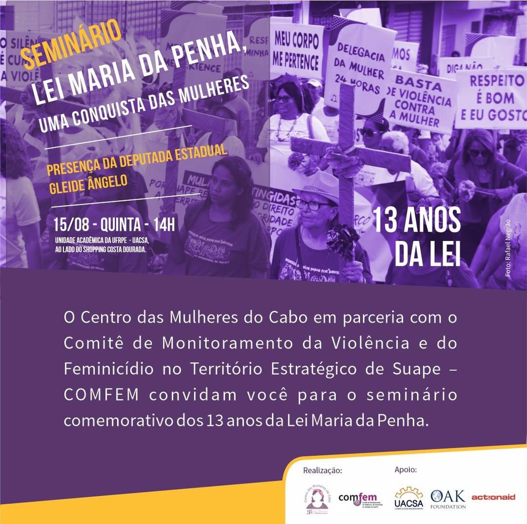 Para refletir sobre os 13 anos da Lei Maria da Penha (Lei 11340/06), o Centro de Mulheres do Cabo promove o seminário “Lei Maria da Penha, uma conquista das mulheres”. A ação acontece em 15/08 (quinta-feira), às 14h, na Unidade Acadêmica do Cabo de Santo Agostinho (UACSA/UFRPE). O debate tem a parceria do Comitê de Monitoramento da Violência e do Feminicídio no Território Estratégico de Suape (COFEM). Na ocasião, estará presente a Deputada Estadual Gleide Ângelo.