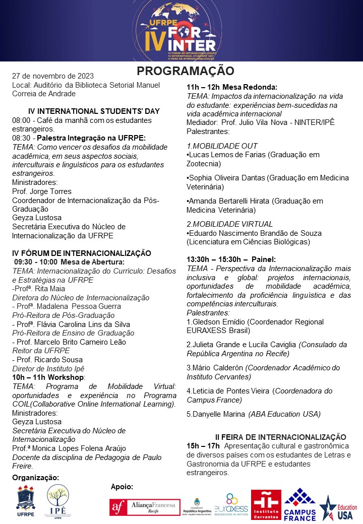 O Núcleo de Internacionalização do Instituto IPÊ divulga as inscrições abertas para o IV FORINTER - IV FÓRUM DE INTERNACIONALIZAÇÃO / IV INTERNATIONAL STUDENTS’ DAY /II FEIRA DE INTERNACIONALIZAÇÃO, que será realizado no dia 27 de novembro de 2023, das 8:30h às 17h, em formato híbrido - presencial e online - no Auditório da Biblioteca Setorial Manuel Correia de Andrade e na plataforma do YouTube da UFRPE.