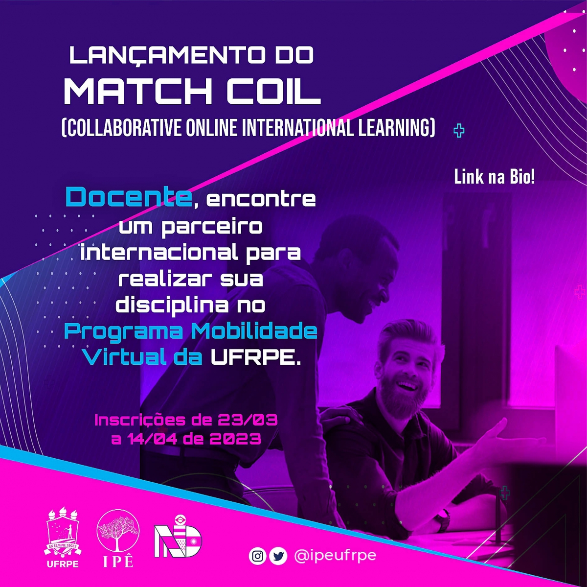 O Núcleo de Internacionalização do Instituto IPÊ divulga o Lançamento do MATCH COIL (Collaborative International Online Lerning), um instrumento para facilitar a inserção do docente no Programa de Mobilidade Virtual da UFRPE.