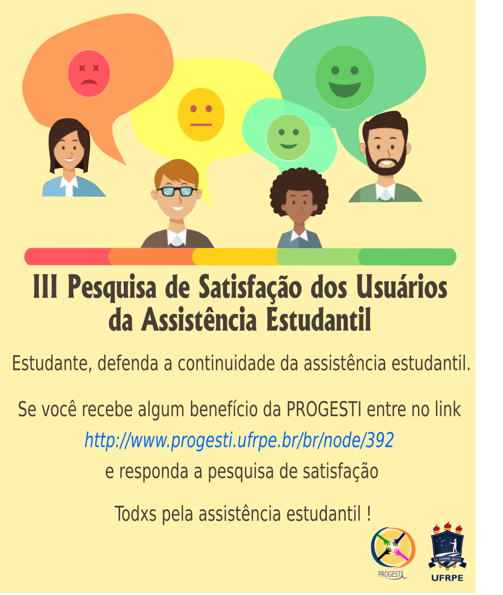 Está disponível a 3ª Pesquisa de Satisfação dos Usuários da Assistência Estudantil da UFRPE. A pesquisa é promovida pela Pró-Reitoria de Gestão Estudantil e Inclusão (Progesti) e é direcionada para estudantes de todas as unidades da Instituição que recebem algum benefício. De acordo com os gestores da pesquisa, os dados irão contribuir com a melhoria dos programas da Assistência Estudantil.