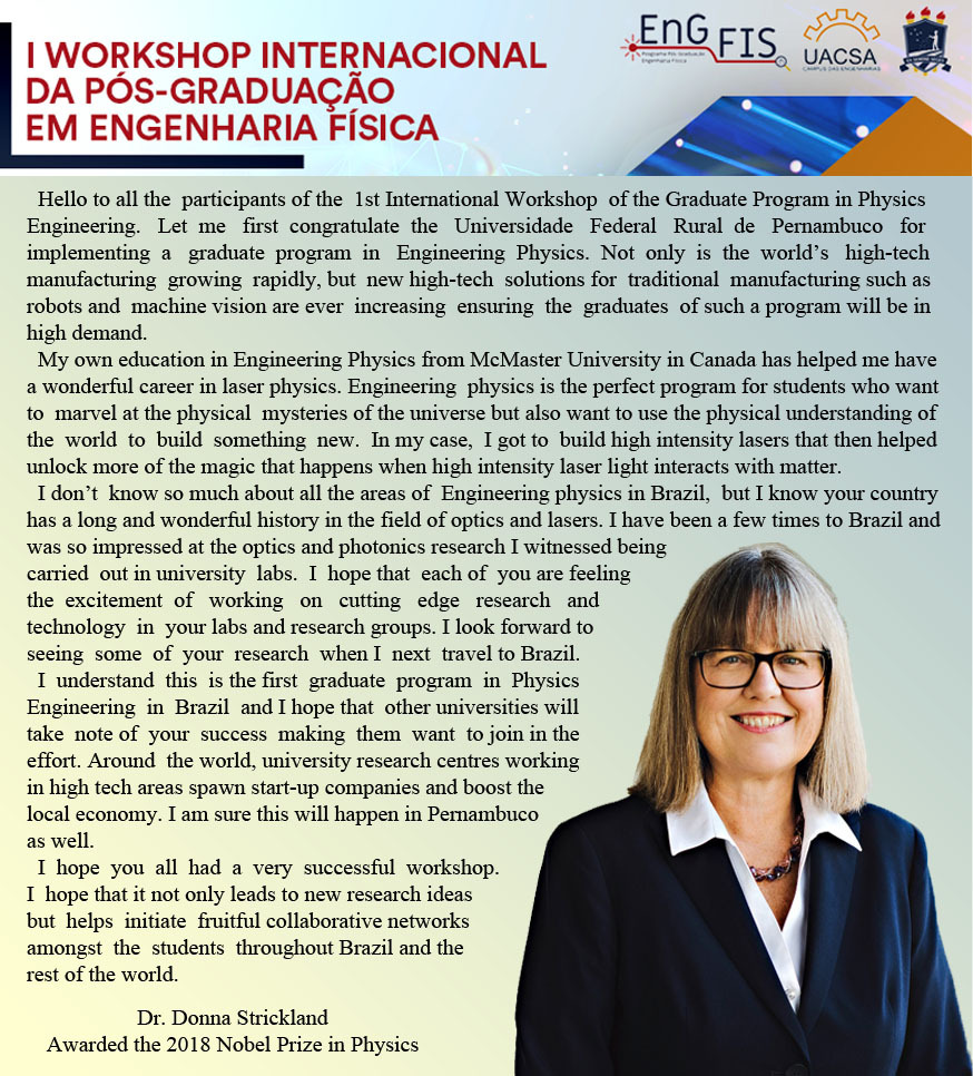 Por ocasião do I Workshop Internacional da Pós Graduação em Engenharia Física, realizado em junho, a pesquisadora Donna Strickland, ganhadora do Prêmio Nobel de Física em 2018, redigiu carta em elogio ao Programa de Pós-Graduação em Engenharia Física, sediado no Campus das Engenharias da UFRPE, na cidade do Cabo de Santo Agostinho (UACSA).