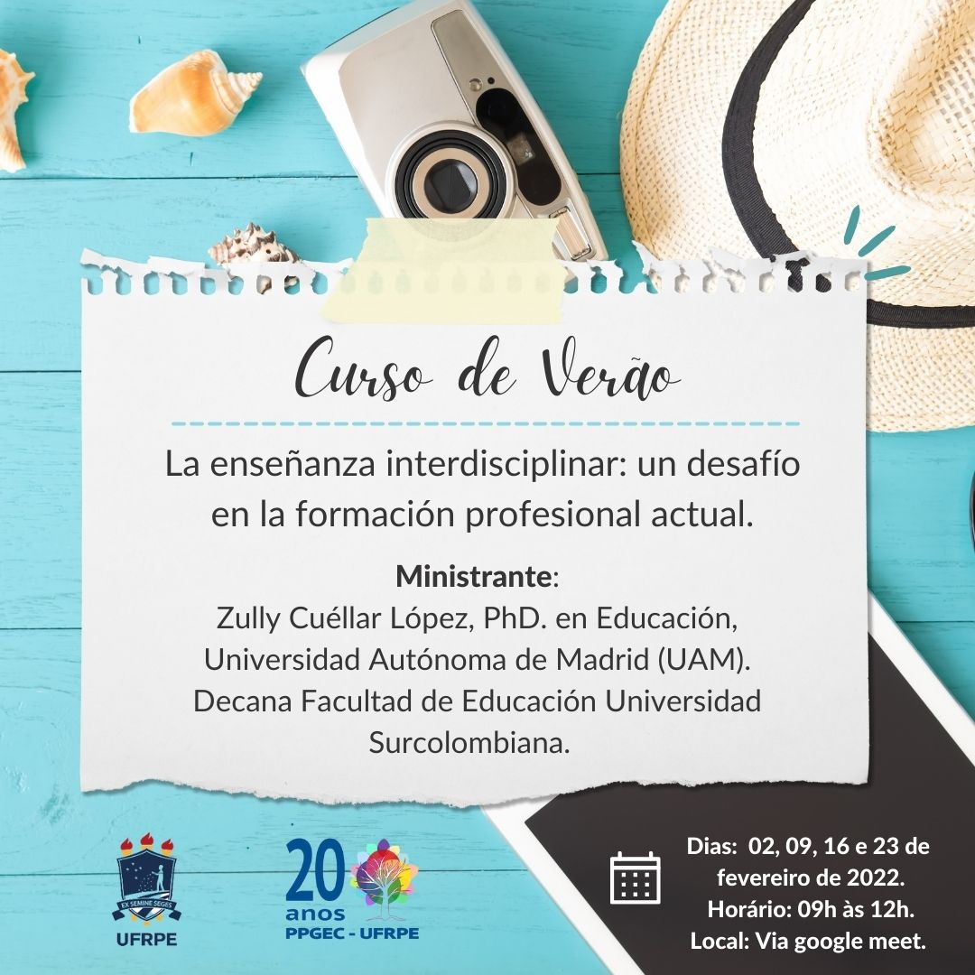 O Programa de Pós-Graduação em Ensino das Ciências (PPGEC), da Universidade Federal Rural de Pernambuco (UFRPE), ofertará nos dias 02, 09, 16 e 23 de fevereiro o Curso de Verão " LA ENSEÑANZA INTERDISCIPLINAR: UN DESAFÍO EN LA FORMACIÓN PROFESIONAL ACTUAL".