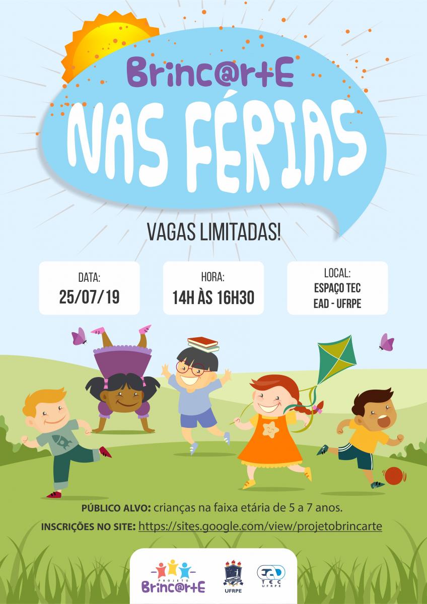 O Projeto Brinc@rte realiza tarde de atividades, hoje (25/07), para 25 crianças de 5 a 7 anos. As ações vão das 14h às 16h30. As atividades lúdicas envolvem contação de história; oficina de construção de animais de materiais recicláveis; brincadeiras em grupo; e brinquedoteca. O projeto será realizado no Prédio Espaço TEC/EAD (em frente a piscina), na UFRPE, em Dois Irmãos. As inscrições podem ser feitas pelo https://bit.ly/2ybl4eE. Só poderá participar da ação a criança que estiver inscrita. Assim que a turma for preenchida, as inscrições serão encerradas. Mais informações: https://sites.google.com/view/projetobrincarte. Em caso de dúvida, escrever para: projetobrincarte.ufrpe@gmail.com