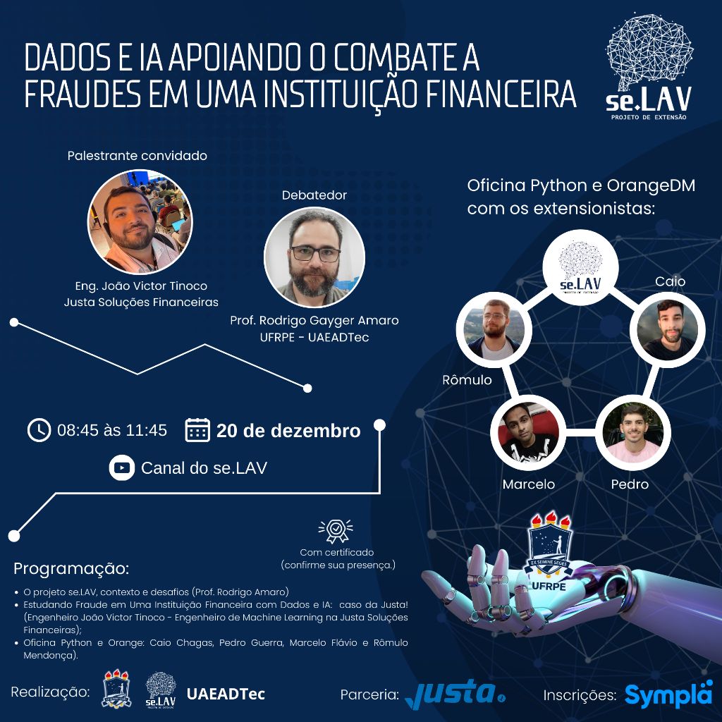 A programação do evento conta com as palestras O projeto se.LAV, contextos e desafios com o professor Rodrigo Amaro, UAEADTec-UFRPE, estudando Fraude em Uma Instituição Financeira com Dados e IA: caso da Justa!  com João Victor Tinoco, Engenheiro de Machine Learning da Justa Soluções Financeiras e uma oficina de Python e Orange, ministrada pelos  extensionistas Rômulo José, Caio Chagas, Marcelo Flávio e Pedro Guerra.