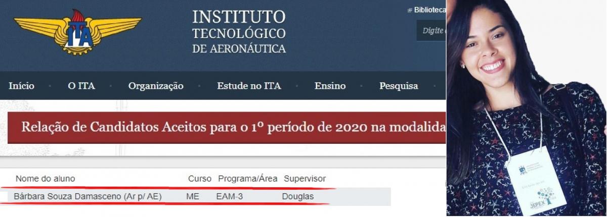 A egressa do Curso de Engenharia de Materiais, Bárbara Souza Damasceno, da Unidade Acadêmica do Cabo de Santo Agostinho (UACSA/UFRPE) foi aprovada no doutorado de Engenharia Aeronáutica e Mecânica do Instituto Tecnológico da Aeronáutica. Bárbara foi aprovada no mestrado, porém após chamada emergencial da CAPES seu projeto “Desenvolvimento de biossensor SAW baseado na junção grafeno/GaN para testes diagnósticos rápidos de infecções virais como a COVID-19”, foi aceito fazendo com que a mesma passasse direto para o doutorado.