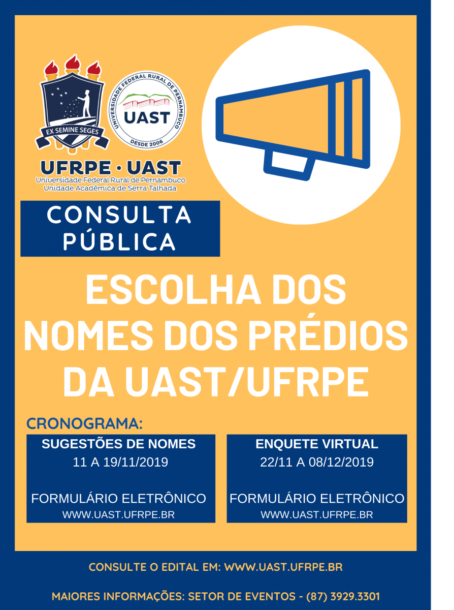 Encontra-se aberto o processo para Consulta Pública junto à comunidade para a escolha dos nomes dos prédios do campus da UAST (UFRPE)