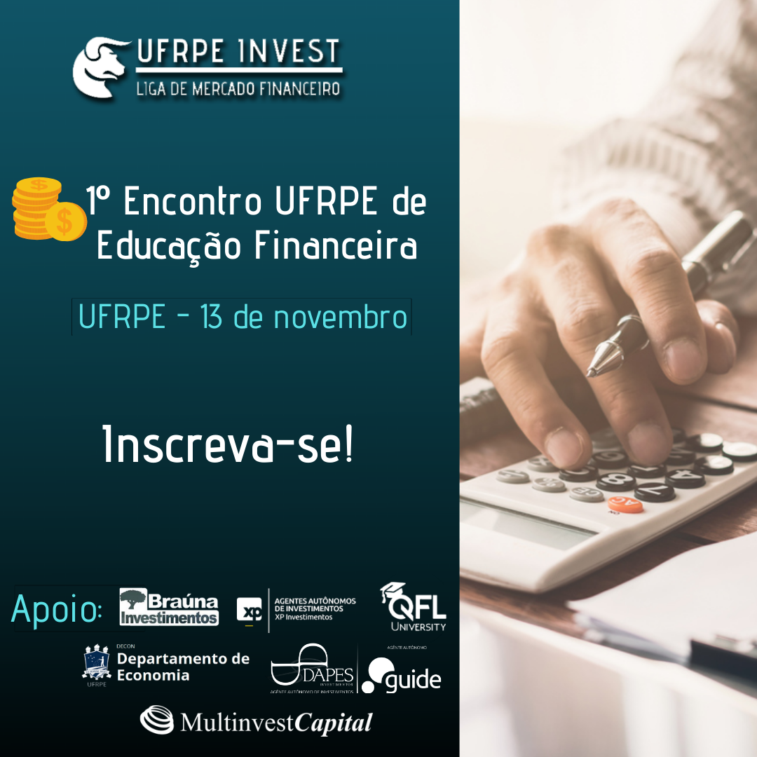 Com o objetivo de aproximar os universitários ao mercado financeiro, a Liga UFRPE Invest realiza o 1º Encontro UFRPE de Educação Financeira. A atividade acontece na próxima quarta-feira (13/11), às 14 horas, na Biblioteca Setorial da UFRPE.
