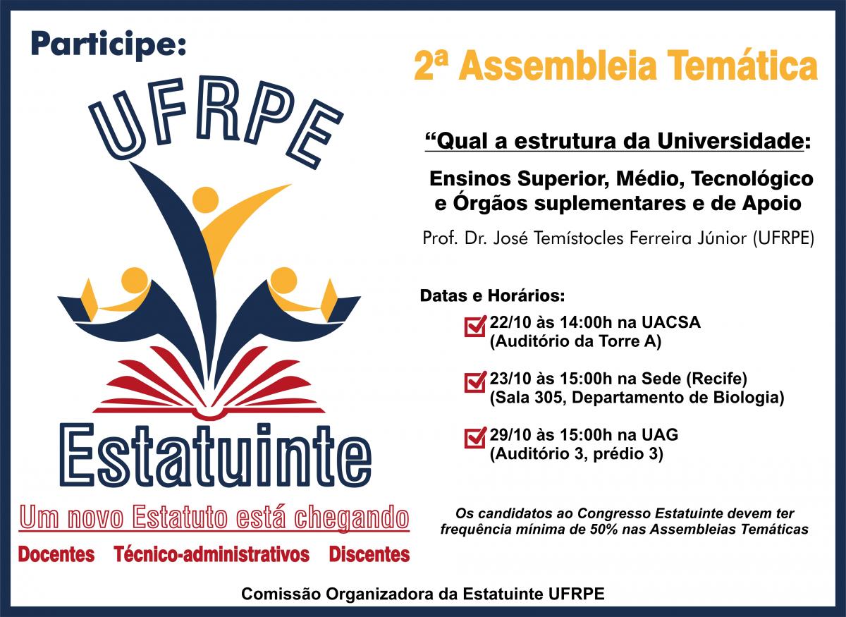 Será realizada nos dias 22, 23 e 29 de outubro a 2ª Assembleia Temática da Estatuinte. O evento acontecerá, respectivamente, na Unidade Acadêmica do Cabo de Santo Agostinho (UACSA), no Auditório da Torre A, às 14h; no campus Dois Irmãos/Recife, no Departamaneto de Biologia, às 15h; e na Unidade Acadêmica de Garanhuns (UAG), no Auditório 3, às 15h.