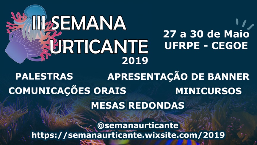 Será realizado entre os dias 27 e 30 de Maio a III Semana Urticante. O evento irá acontecer no auditório do CEGOE e é organizado pelo Grupo de Pesquisa em Antozoários (GPA) que tem como coordenadores a professora Paula Braga Gomes (SEDE/UFRPE) e o professor Carlos Daniel Pérez (CAV/UFPE).