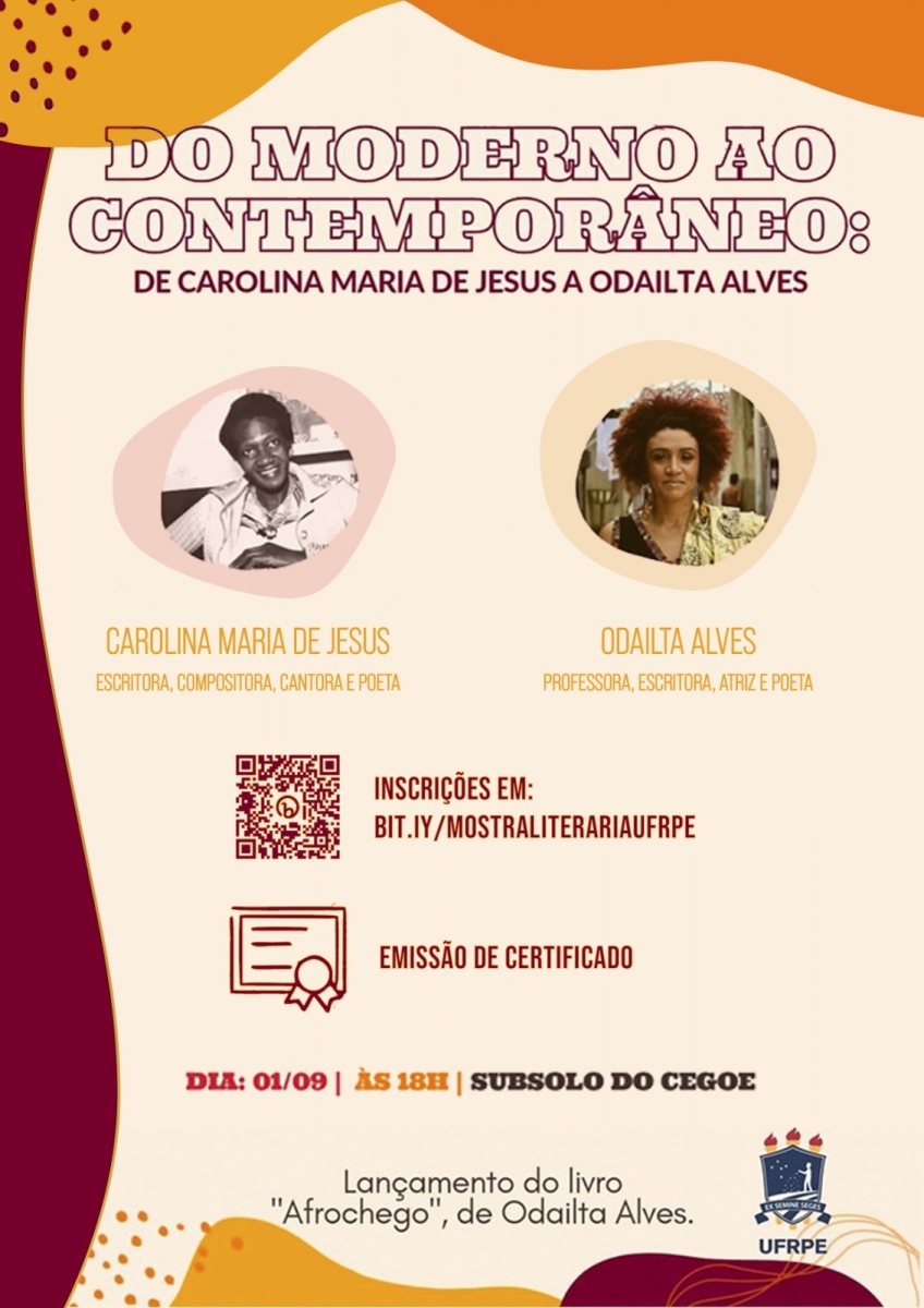 A UFRPE recebe, nesta sexta-feira (01/09) a Mostra Literária Do moderno ao contemporâneo: de Carolina Maria de Jesus a Odailta Alves. O evento acontece das 18h às 20h no subsolo do Cegoe e faz parte da disciplina literatura brasileira C. Haverá também o lançamento do livro Afrochego de Odalita Alves, que estará presente na ocasião. Além disso, a Mostra terá exposição de livros, declamação de poemas e uma roda de conversa.