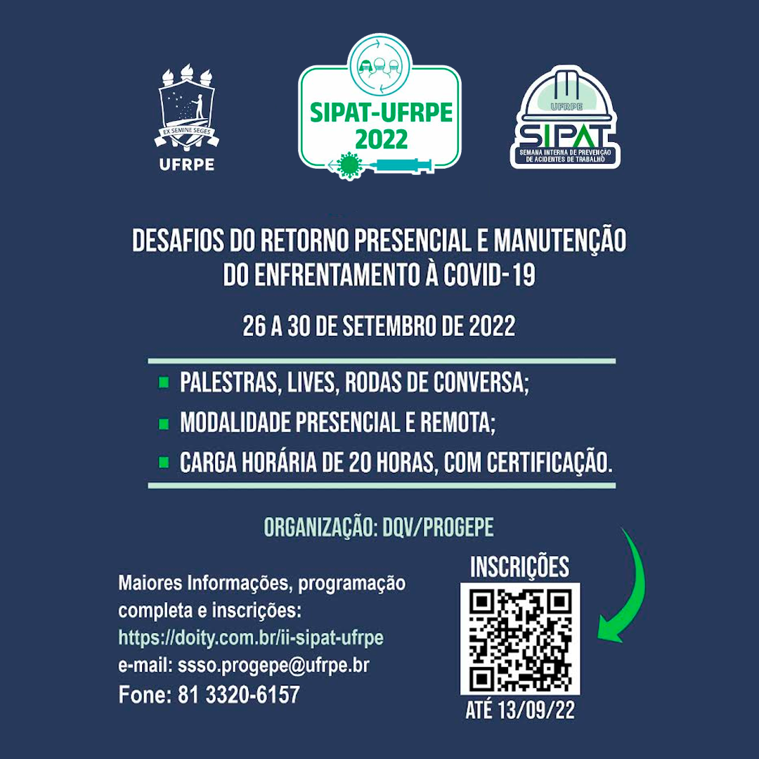 A Universidade Federal Rural de Pernambuco (UFRPE) recebe, entre os dias 26/09 e 30/09, a Semana Interna de Prevenção de Acidentes do Trabalho (SIPAT). O evento é coordenado pelo Departamento de Qualidade de Vida (DQV) e tem como principal objetivo conscientizar os profissionais (servidores e prestadores de serviços) sobre a necessidade de evitar acidentes e doenças do trabalho, estabelecendo as medidas a serem tomadas para impedir a sua ocorrência. Representa também uma oportunidade de atualização de temas relacionados à promoção da saúde e qualidade de vida no atual contexto do nosso pais.