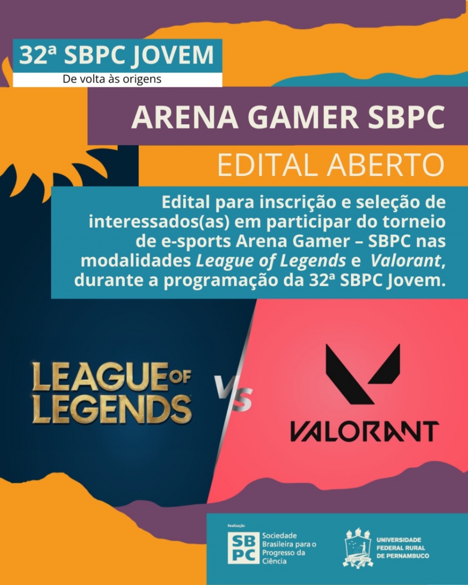 Edital para inscrição e seleção de interessados(as) em participar do torneio de e-sports _Arena Gamer – SBPC nas modalidades _League of Legends _e _Valorant, durante a programação da 32ª SBPC Jovem.